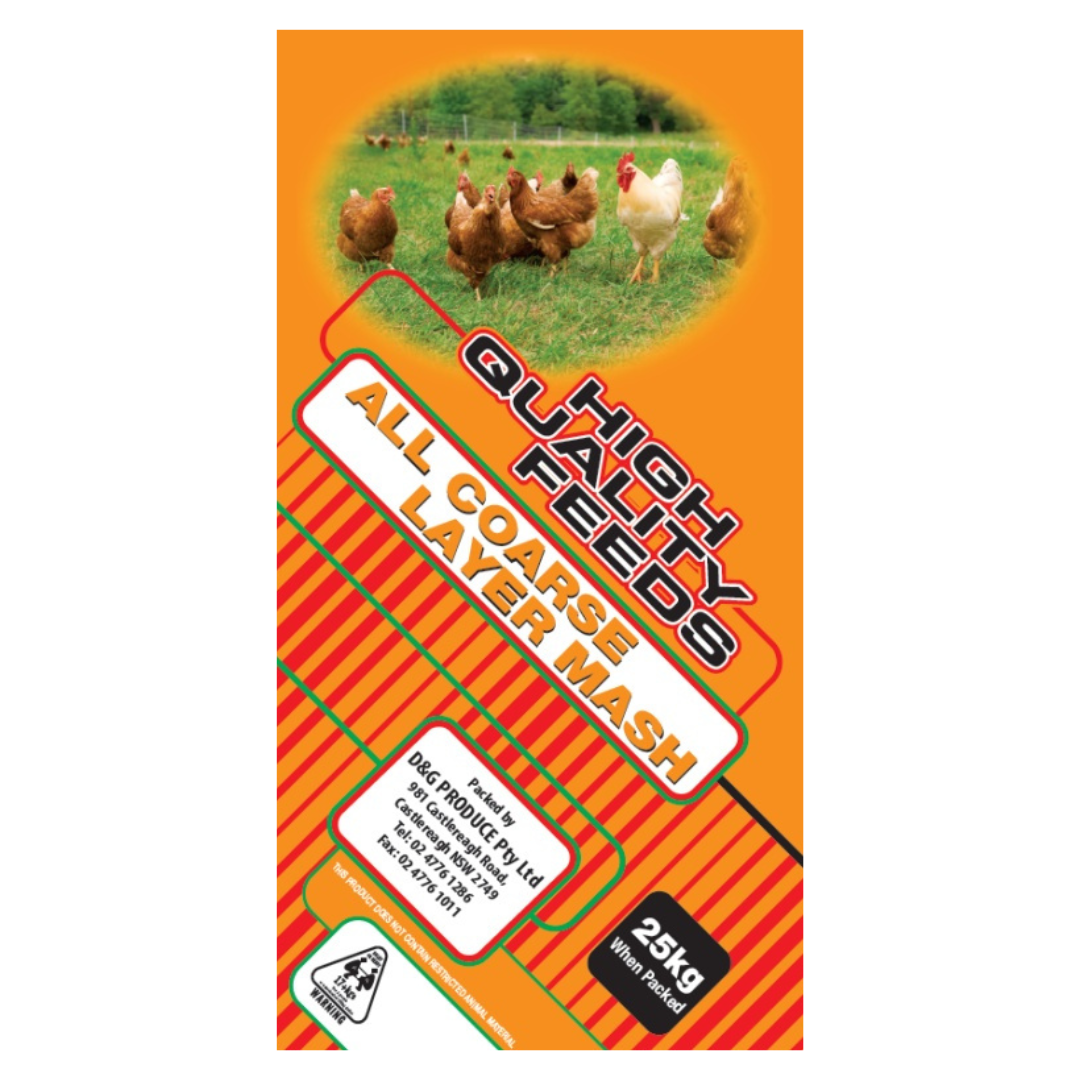 D&G has formulated its ALL COARSE MASH as a blend of natural ingredients to produce a high protein complete feed. The mash provides the essential vitamins and minerals necessary to maintain good health and to promote consistent laying and production of quality eggs.
